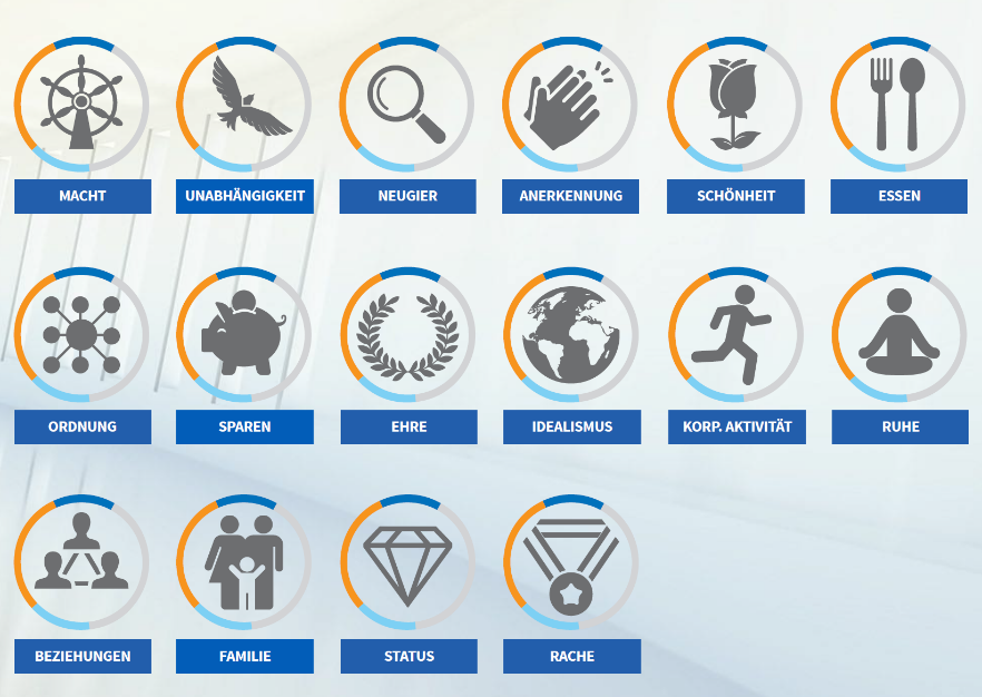 Wissenschaftlich fundiert mittels Faktorenanalyse (mittlerweile wurden zehntausende Profile aus vielen Ländern der Welt ausgewertet) lassen sich anhand des Reiss Motivation Profile® 16 Lebensmotive unterscheiden.