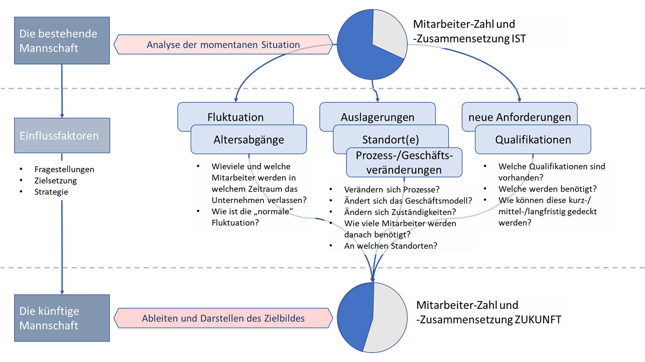 - Dokumentation der erforderlichen Schritte (z. B. Qualifikation, Neugewinnung von Mitarbeitern, Abbau)